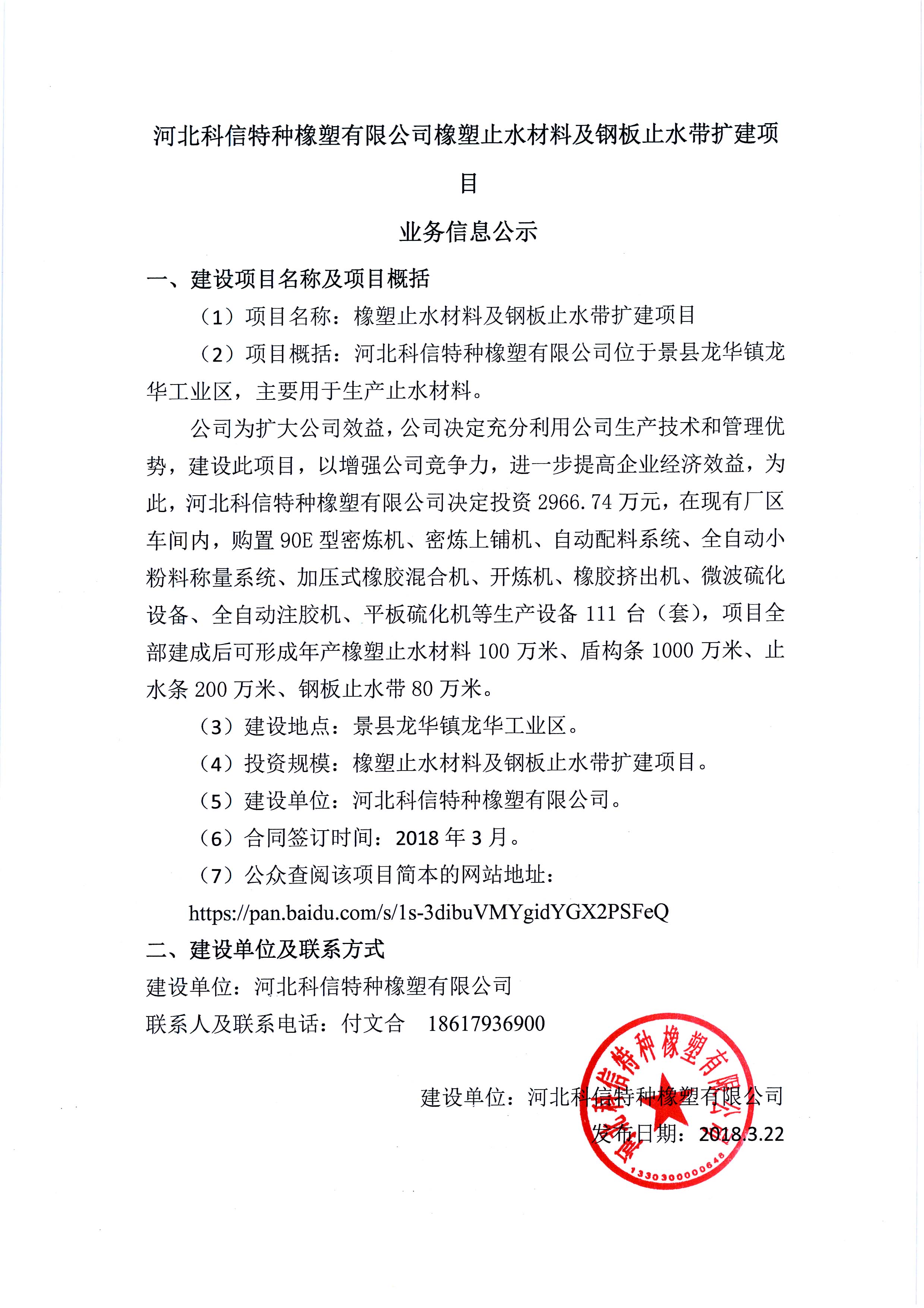 河北科信特種橡塑有限公司橡塑止水材料及鋼板止水帶擴(kuò)建項(xiàng)目業(yè)務(wù)信息公示如下: