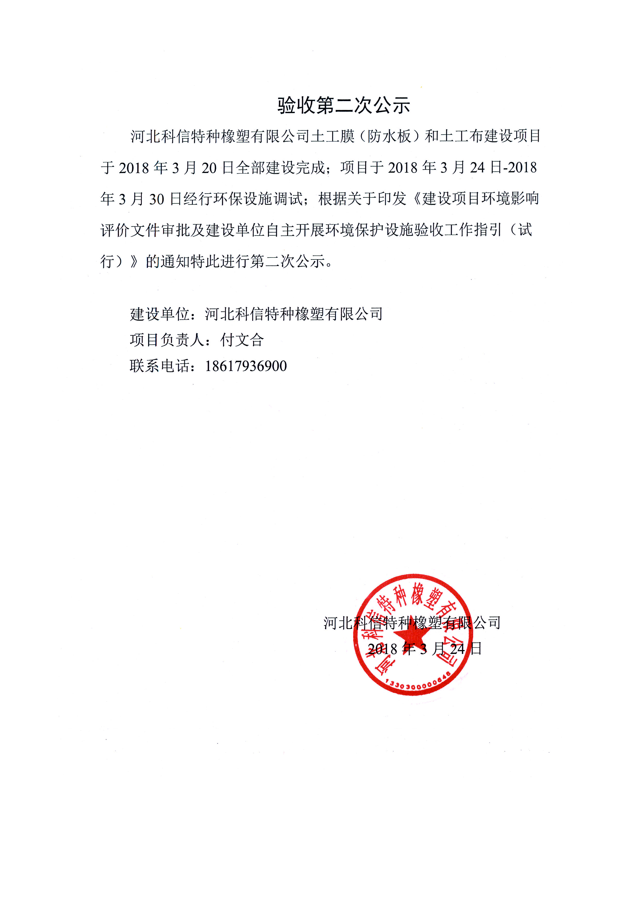 河北科信特種橡塑有限公司土工膜(防水板)和土工布建設項目于2018年3月20日全部建設完成;項目于2018年3月24日-2018年3月30日經行環(huán)保設施調試;根據關于印發(fā)《建設項目環(huán)境影響評價文件審批及建設單位自主開展環(huán)境保護設施驗收工作指引(試行)》的通知特此進行第二次公示。