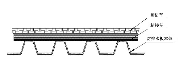 基于結(jié)構(gòu)與安裝一體化、防排結(jié)合、由線排水到面排水的綜合設(shè)計理念;在防排水板本體上粘合粘接帶,并佩帶與粘接帶匹配的自粘布形成了自粘式防排水板新型結(jié)構(gòu),鋪掛簡單,效率高,搭邊處采用熱熔焊接,防排水效果可保證。 |